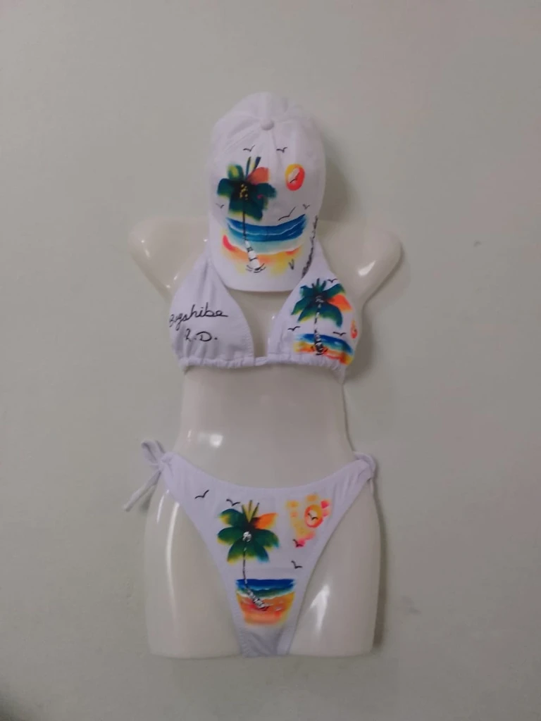 Instrucciones de Cuidado: Para mantener los colores vibrantes y la integridad de la pintura, se recomienda lavar el bikini y la gorra a mano con agua fría y jabón suave. Secar a la sombra.